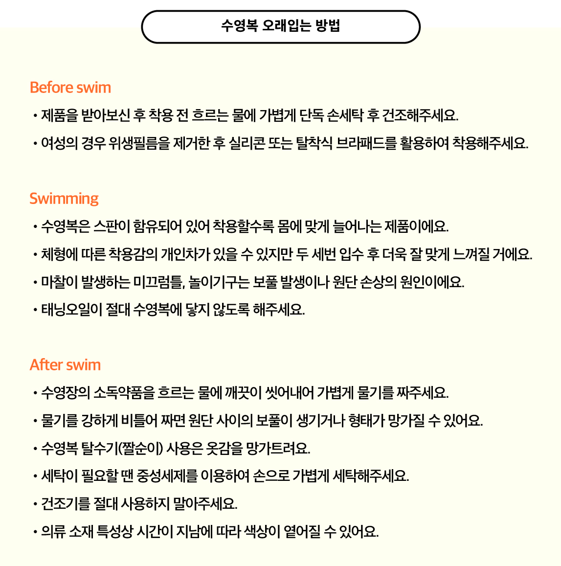 - 비벼 빨거나 탈수기능을 사용하지 마십시오.- 찬물에 충분히 헹구어 약하게 짠 뒤 그늘에서 자연건조 하십시오.- 물에 오래 담가두거나 젖은 상태로 보관 시 이염 및 오염의 원인이 됩니다.- 반드시 단독세탁 후 보관하십시오.- 표백제 또는 섬유유연제를 사용하지마세요.- 건조기 사용 시 제품이 훼손될 수 있습니다.