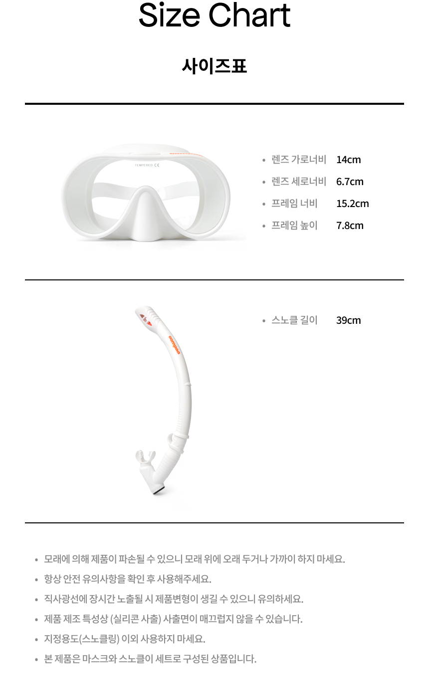 •렌즈 가로너비 : 15cm •렌즈 세로너비 : 7.2cm •프레임 너비 : 16.5cm •프레임 높이 : 8.5cm•스노클 길이 : 35cm •스노클 캐리어 너비 : 9cm