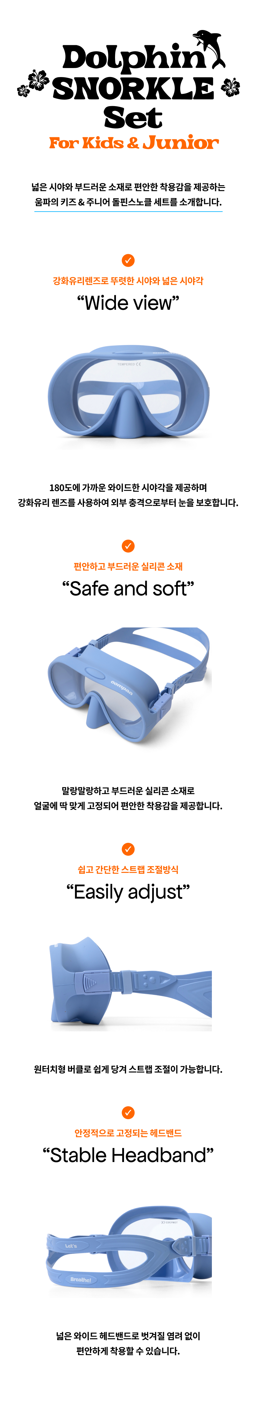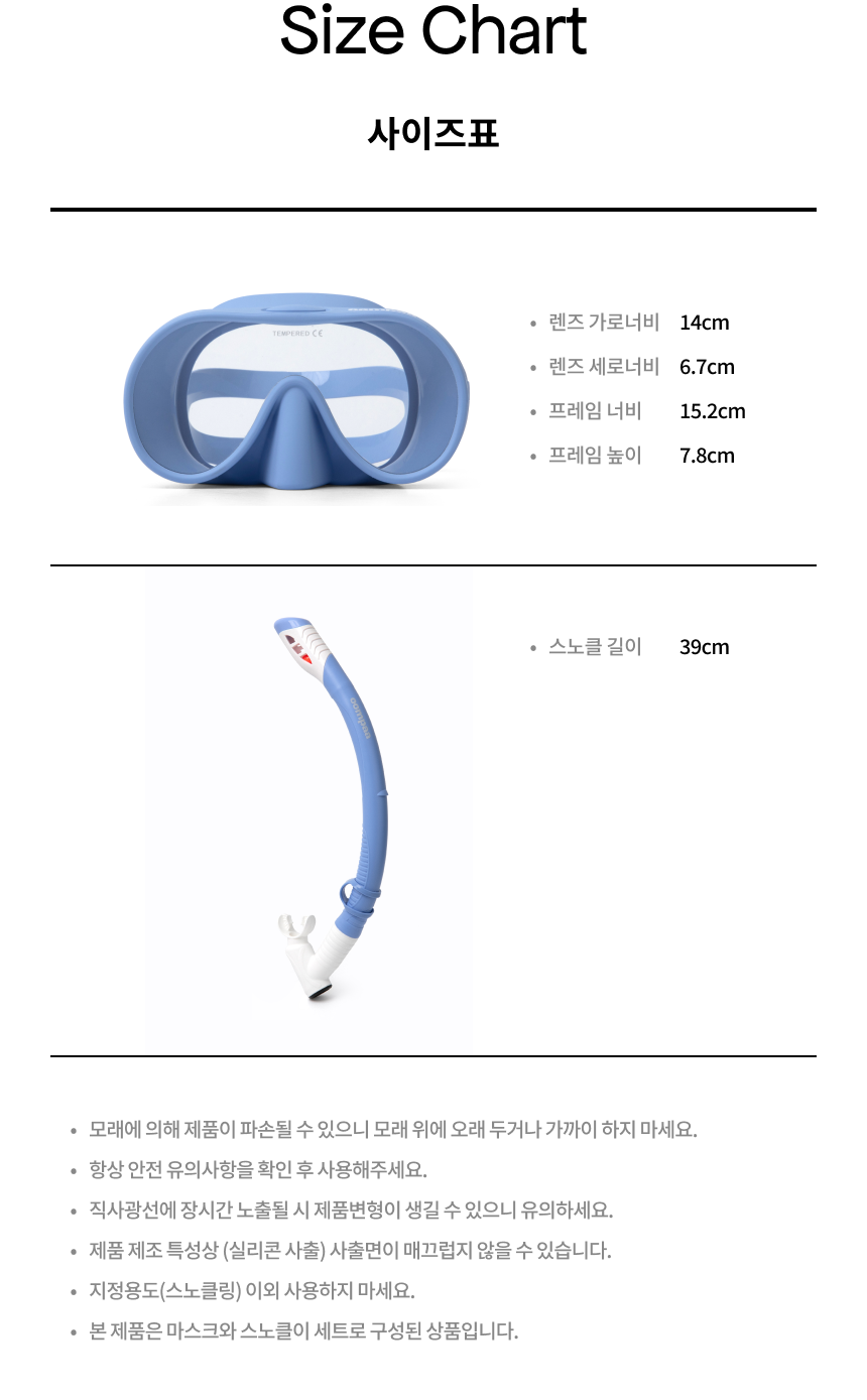 •렌즈 가로너비 : 15cm •렌즈 세로너비 : 7.2cm •프레임 너비 : 16.5cm •프레임 높이 : 8.5cm•스노클 길이 : 35cm •스노클 캐리어 너비 : 9cm